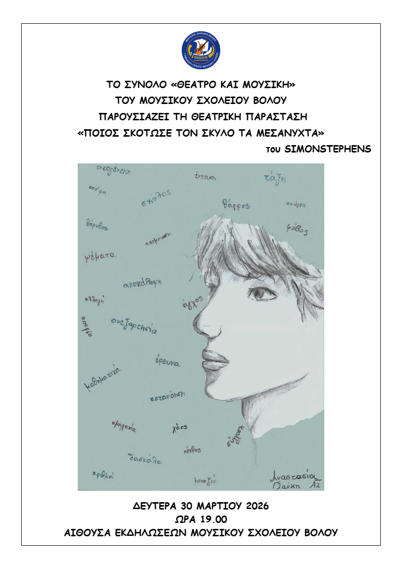 Τη Δευτέρα 30 Μαρτίου 2026 και ώρα 19.00, στην Αίθουσα Εκδηλώσεων του Μουσικού Σχολείου Βόλου, οι μαθητές του Συνόλου «Θέατρο και Μουσική» θα παρουσιάσουν τη θεατρική παράσταση με τίτλο «Ποιος σκότωσε τον σκύλο τα μεσάνυχτα» του Simon Stephens, βασισμένο στο ομώνυμο μυθιστόρημα του Mark Haddon.