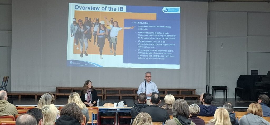 Η κ. Κ. Μ. με συνεχή και βαθιά εμπειρία στο Diploma Programme του IB από το 1993 ως εκπαιδευτικός και ως στέλεχος και Σύμβουλος Πανεπιστημίων από το 2000, παρουσίασε αναλυτικά τη δομή, τη λειτουργία και τις απαιτήσεις του Προγράμματος, στο πλαίσιο της συμβολής της στην ένταξη του IB στη δημόσια εκπαίδευση ως Σύμβουλος του ΙΕΠ. Η κ. Κ. Μ. μίλησε σε γονείς, μαθητές και μαθήτριες του σχολείου μας σχετικά με τις διαδικασίες και το χρονοδιάγραμμα εισαγωγής σε Πανεπιστήμια του εξωτερικού.
